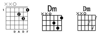 Dm是由D、F、A三个音叠置构成的小三和弦,是C大调中的II级和弦。以上为常见的三种Dm和弦图。