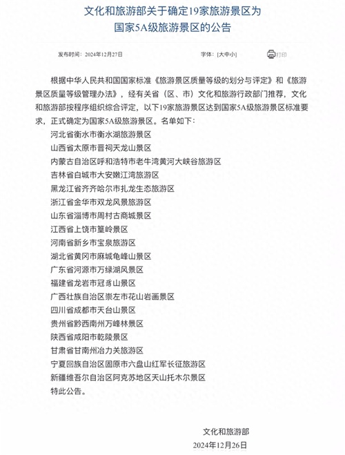 12月27日,文化和旅游部发布《关于确定19家旅游景区为国家5A级旅游景区的公告》,广东省河源市万绿湖风景区正式确定为国家5A级旅游景区。这也是河源首个5A级旅游景区。