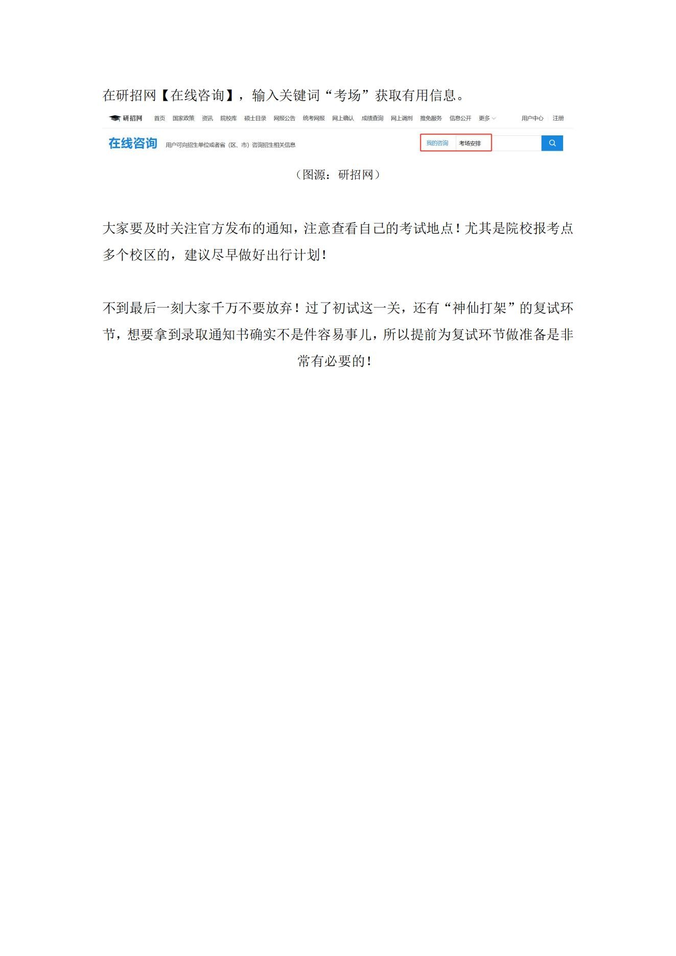 上考场前,打印准考证和尽快确认考场位置、订酒店是需要大家重点关注的事情。关于准考证打印相关事宜可点击《今年考研最后关注的一件事.....》查看!
