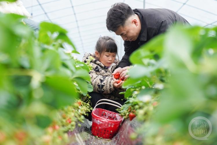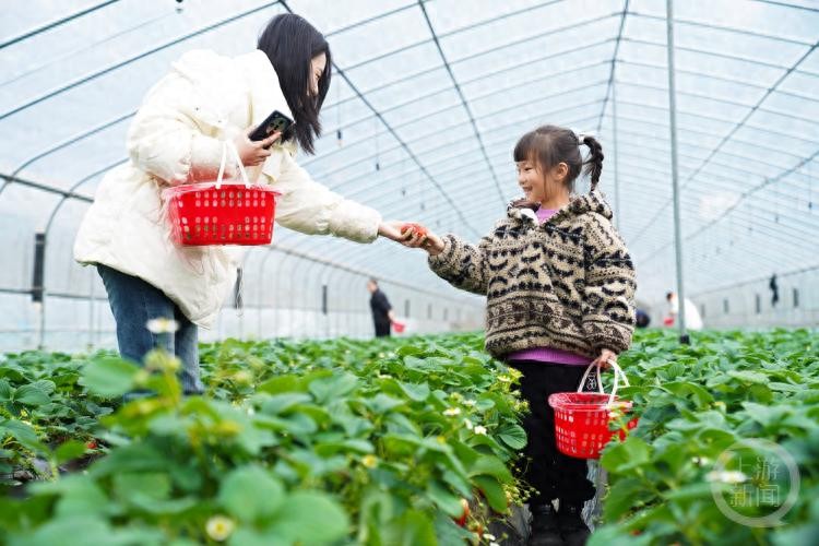 1月27日,重庆市北碚区童家溪镇,家长带着孩子在体验草莓采摘的乐趣。