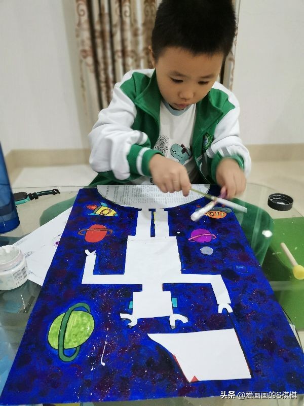 最后用笔甩些白色点点上去(用纸剪出机器人、国旗和气球的形状盖住)