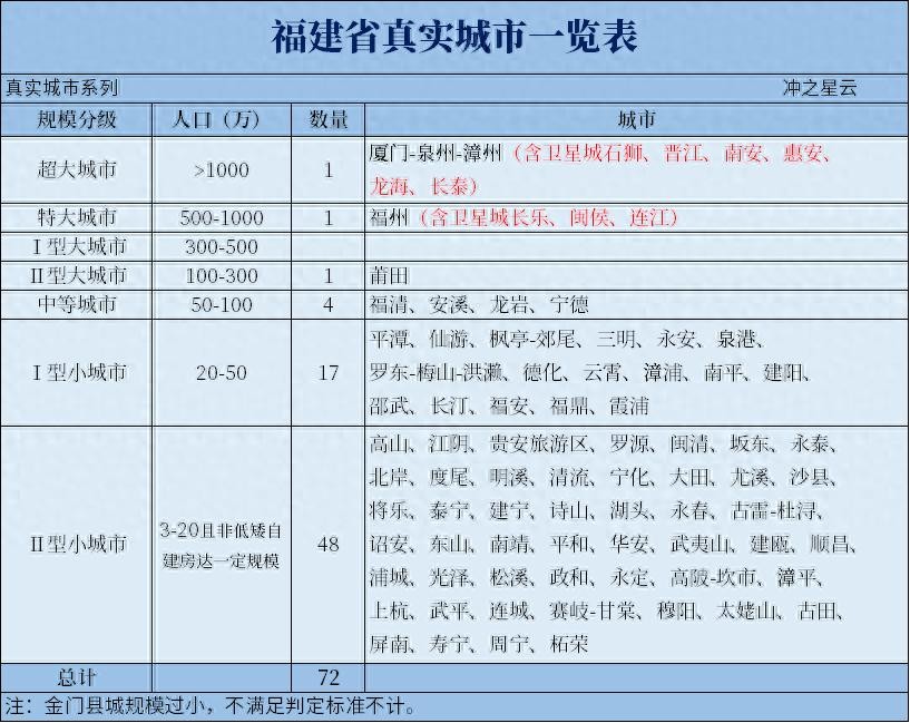 经判定统计,福建省共有72座建成区独立、完整的真实城市。金门县城过小,达不到城市的判定标准,在此不计。