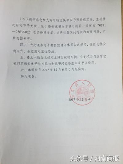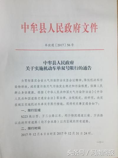 河南商报记者了解到,中牟县政府今天发布通告,从12月6日零时起,实施机动车单双号限行。(河南商报编辑 张雅露 见习编辑 高予妍)