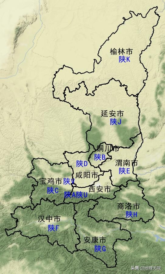 陕西省简称“陕”或“秦”,管辖10个地级市。车牌号第一个字母从陕A排到陕V,分别是: