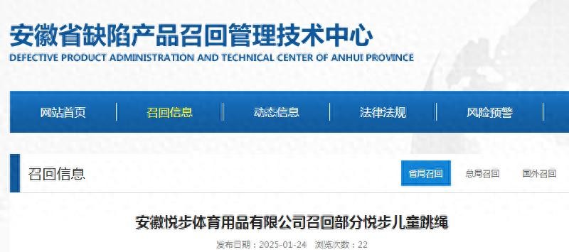 中国质量新闻网讯 据安徽省缺陷产品召回管理技术中心网站消息,日前,安徽悦步体育用品有限公司按照《消费品召回管理暂行规定》的要求,向安徽省市场监督管理局、合肥市市场监督管理局报告了召回计划,将自即日起,召回2024年3月生产的悦步儿童跳绳(型号AT0323),涉及数量为300根。