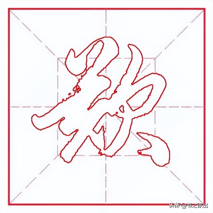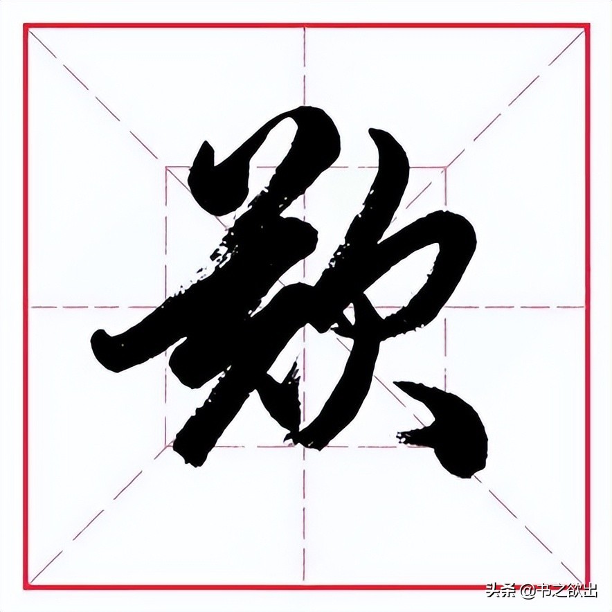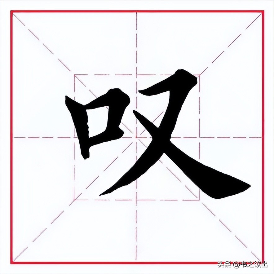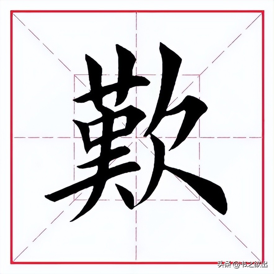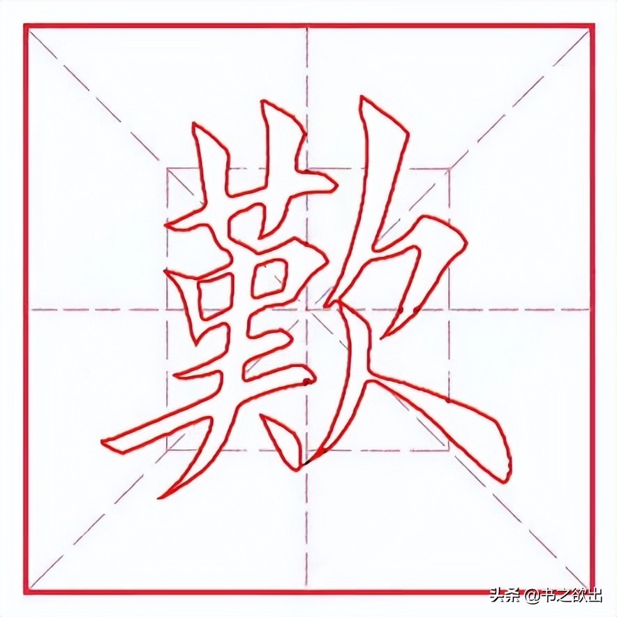 右部“欠”字撇笔高起,角度稍立;横撇起笔稍靠下,横画大抗肩,不要写长,到位后稍提锋顿笔写撇,行笔指向与左撇不同;下面“人”字左收右放,撇画起笔偏左,撇身勿重,角度偏立,且弯而有力;反捺起笔与左边长横的收笔平齐,顺势向右下行,渐重,到位后向右下轻顿回锋收笔,收笔略高于左边竖撇撇尖。