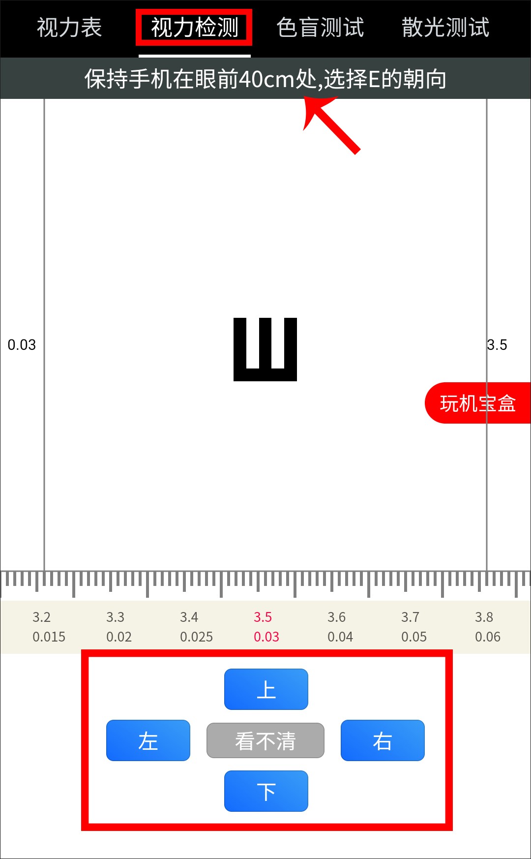 打开这个小工具,我们可以先进行“视力检测”,不过需要注意保持手机在眼前40cm处。然后依次选择‘E’字的开口方向,如果看不清楚,就点击中间的“看不清”。