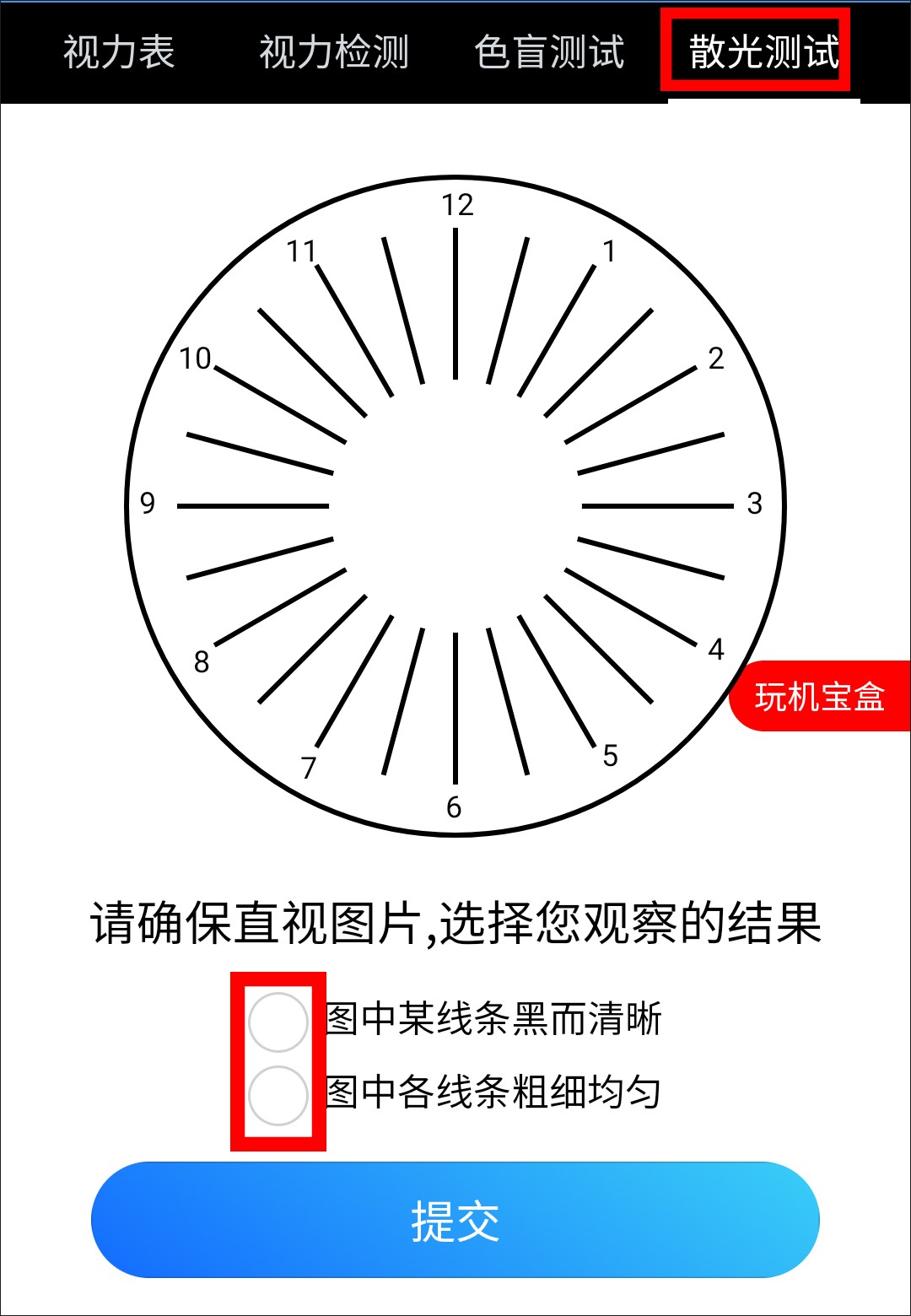还可以接着进行“散光测试”,选择自己的观察结果,就可以判断出自己是否散光。