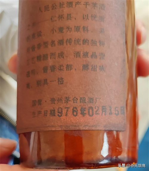 该瓶酒净含量500毫升,酒精53度。酒瓶上说明写道:“人民公社酒产于茅酒之乡——仁怀县,以优质的高粱、小麦为原料,采用酱香型名酒传统的独特工艺精酿而成,酒液晶莹透明,酱香柔郁,醇甜味爽、别具一格。