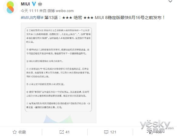 【天极网手机频道】日前小米官方刚刚推送了MIUI8稳定版的“先行版”MIUI7.5稳定版,并表示MIUI8稳定版将于8月正式发布。而今日上午小米MIUI官微正式曝光了MIUI8稳定版的发布时间:最快8月16日前。
