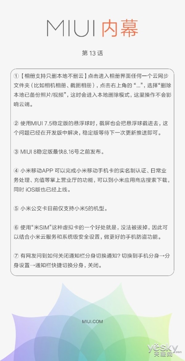 另外,小米还在MIUI内幕(之前的MIUI曝)中表示,小米MIUI8系统中,智能删除本地已备份照片/视频,而会不影响云端文件;同时强调小米公交卡目前仅支持小米5手机一款机型,而且小米公交卡第二批支持城市正在北京、武汉、广东岭南通内测招募等。
