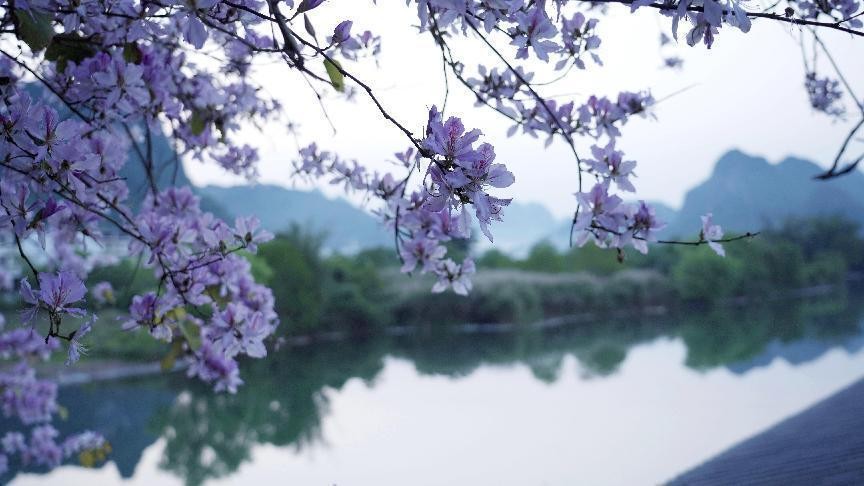 央广网桂林4月24日消息(记者黄月芬)芳菲四月,春意正浓。在广西桂林市阳朔县遇龙河两岸,洋紫荆闻春绽放,艳丽的花朵爬满枝头。夕阳下的遇龙河甚是美丽,过往行人纷纷驻足,沉醉于山水之间。