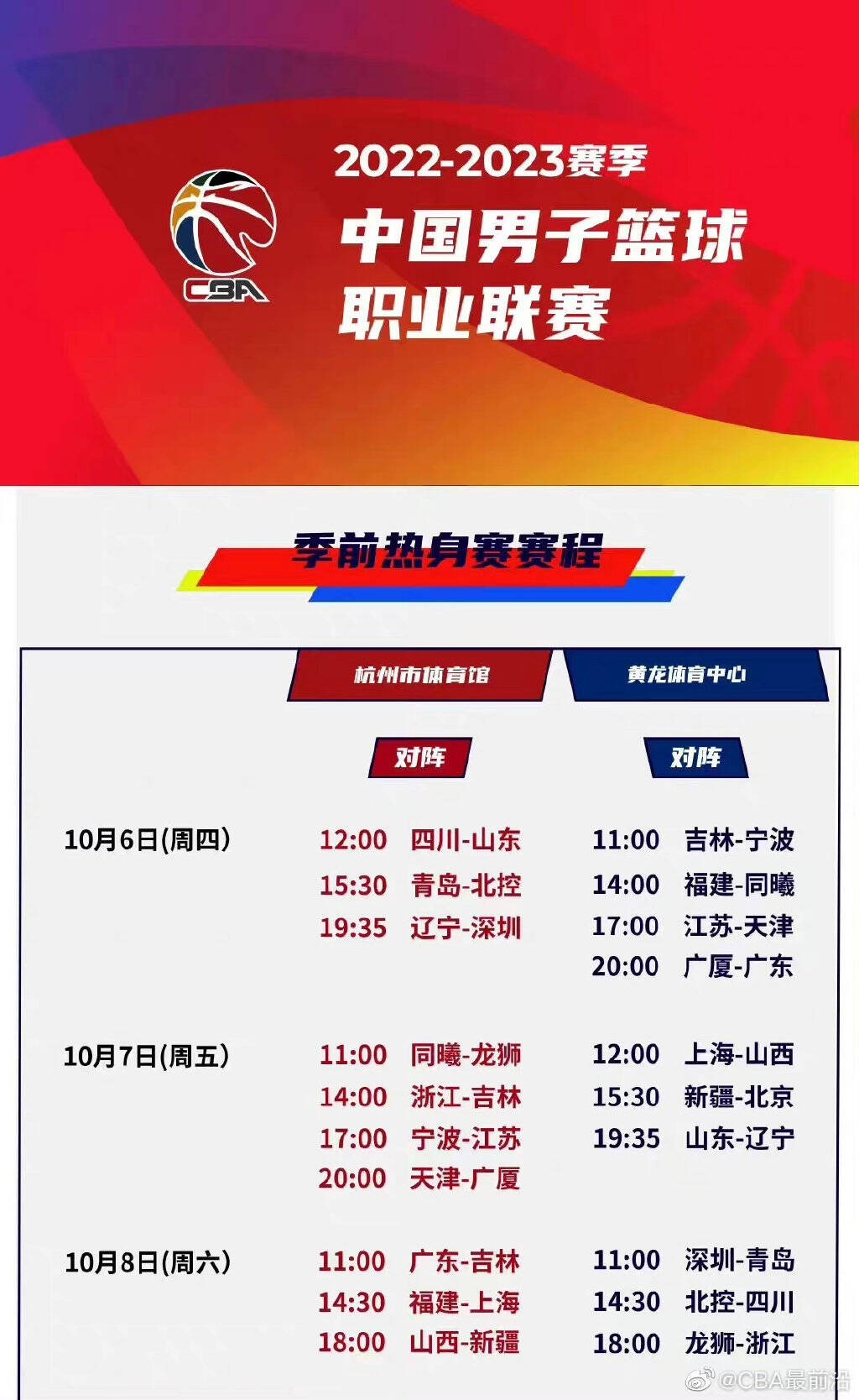 齐鲁网·闪电新闻9月22日讯 山东电视体育频道最新消息,CBA官方宣布,2022-2023赛季中国男子篮球职业联赛(CBA联赛)常规赛第一阶段比赛将于10月10日在浙江省杭州市举行。在此之前,10月6日、7日和8日将会进行为期三天的季前赛,山东男篮首战将对阵四川,第二场迎战辽宁。