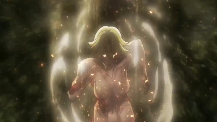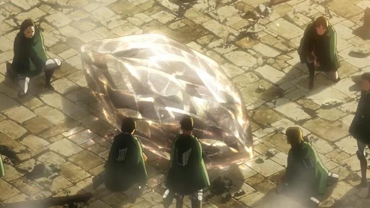 能力三 结晶化,让本体包裹极硬的紫水晶,即使艾伦崩坏了一嘴的牙,也不能破坏丝毫,但最后因为偶然的原因,使用颚巨把水晶咬破,从而被艾伦吃掉。