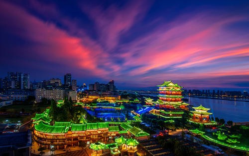 江西省南昌市滕王阁旅游区:滕王阁,江南三大名楼之一,位于江西省南昌市西北部沿江路赣江东岸,始建于唐永徽四年(公元653年),因唐太宗李世民之弟——滕王李元婴始建而得名,又因初唐诗人王勃诗句“落霞与孤鹜齐飞,秋水共长天一色”而流芳后世。