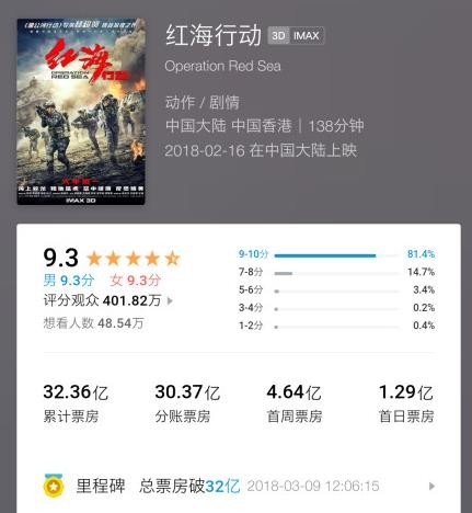 《红海行动》将延期至 4 月 15 日下映,目前累计票房 32.36 亿元。这部虽说也是主旋律,但是「不无脑」,当战争片来看可以说很不错了。