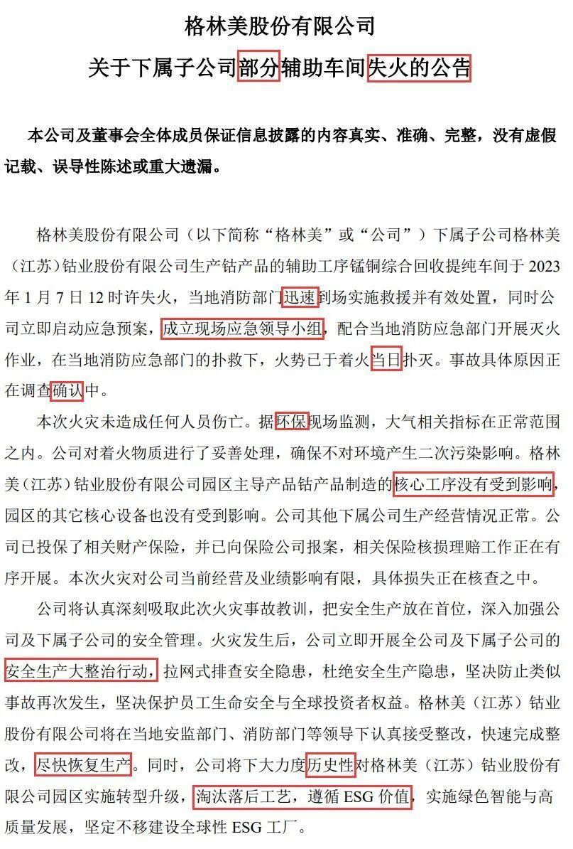 据公司回应,此次事故中,格林美泰兴工厂主产品钴产品制造核心工序没有受到影响,格林美其他下属公司生产经营情况正常,预计本次事故对格林美当前经营影响有限。