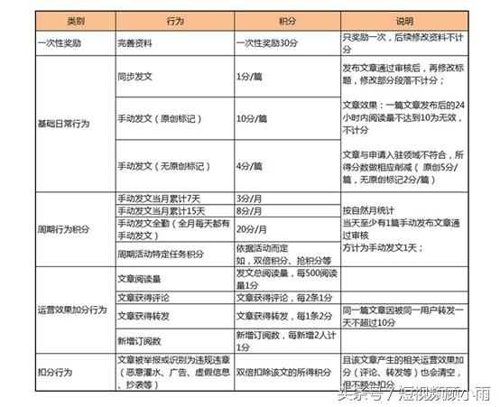 而如何能快速提高一点号的等级呢,增加积分的行为分为四个,分别是:一次性奖励,基础日常行为,周期行为积分,运营效果加分行为。下图是一点后台详细的加分政策,总结一下就是对于原创文章手动发布利于加分,并且积分也会根据我们的阅读数,评论数和转发数相联系进行相应的增加我们的积分,所以提高我们的内容质量也是很有利于等级积分的增长的。