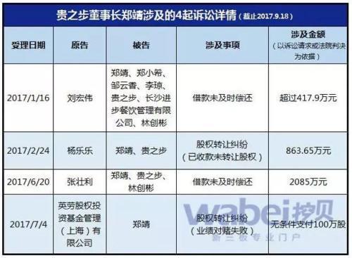 2017年开始,贵之步风险开始集中爆发,董事长郑靖卷进4起诉讼纠纷,贵之步公司主体作为直接被告或担保方卷入其中。据统计,郑靖涉及的4起诉讼中2起因借款未及时偿还导致,2起主要因为股权纠纷。