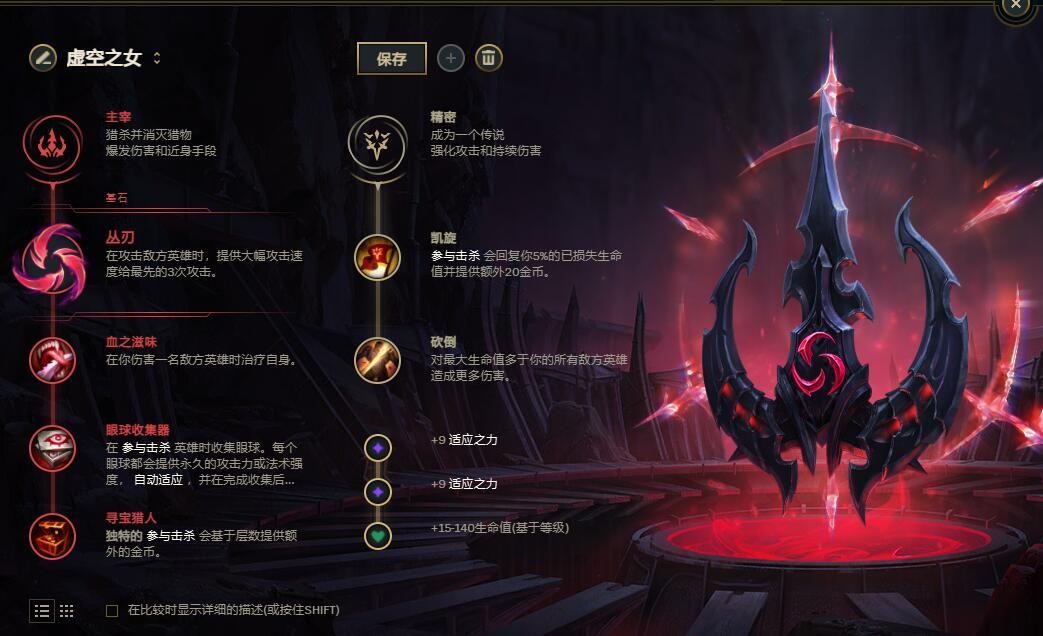 精密的小符文推荐砍倒,生命值差距超过10%便能触发5%的额外伤害,对于定位主POKE副收割并且装备选择中基本不会出现太多血量装的卡莎来说是最好的选择了。