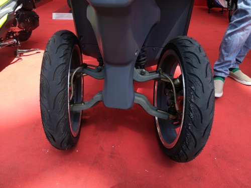 前轮悬挂系统为可倾斜式双叉臂式,通过前面板的一个拉杆可以在静止时固定,防止车身倾倒。