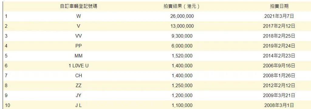 香港史上拍卖价最高的车牌是“W”,于2021年拍出,当时竞投非常激烈,经过119次叫价,最终以2600万港元售出,为底价的5200倍,刷新了自订车辆登记号码拍卖史上“最高售价”纪录。