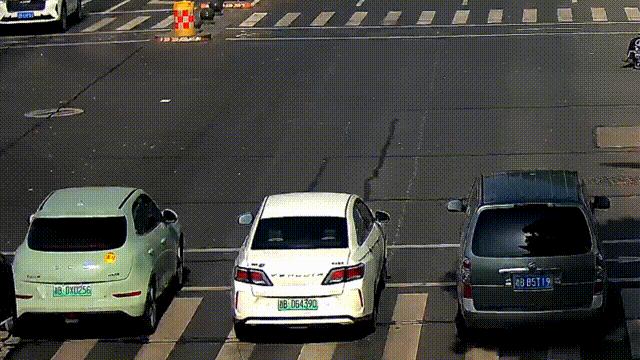 一辆刚经过等待线的灰色小车