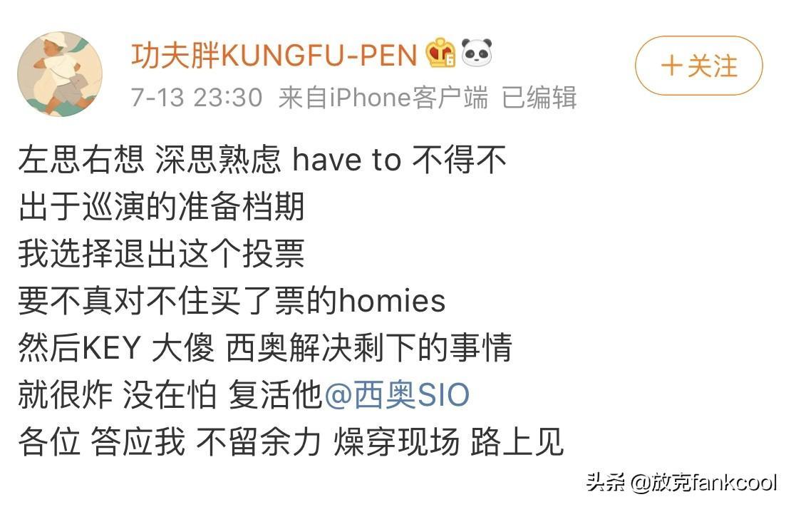 功夫胖放弃复活,表示自己因为巡演档期与节目组复活赛冲突,如果要去录制节目的话,可能就要辜负自己买了票的homies,所以自己退出这一次的复活赛,希望大家把票投给西奥。