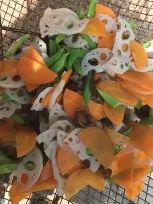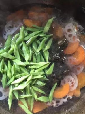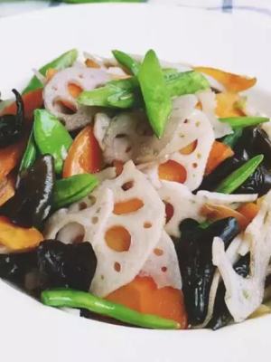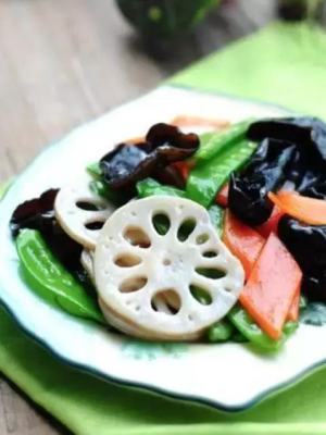 4、把莲藕,荷兰豆,木耳寓意,胡萝卜,一起炒倒入锅中,改成大火这道,贴锅边菜名倒入薄芡月色,快速名菜翻炒两下,出锅!