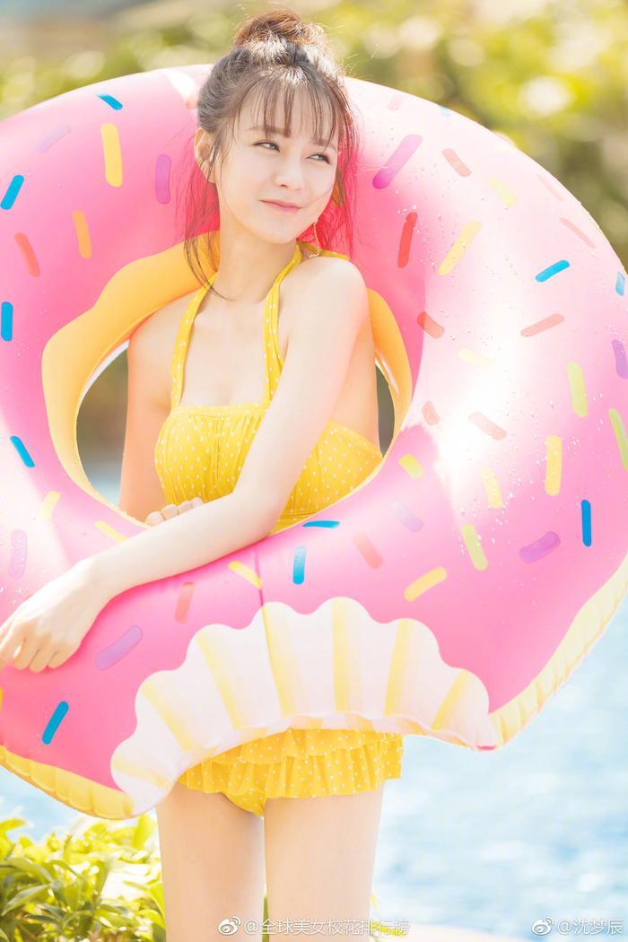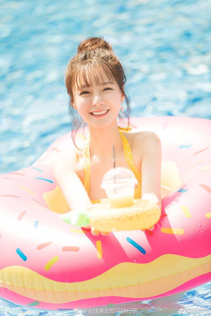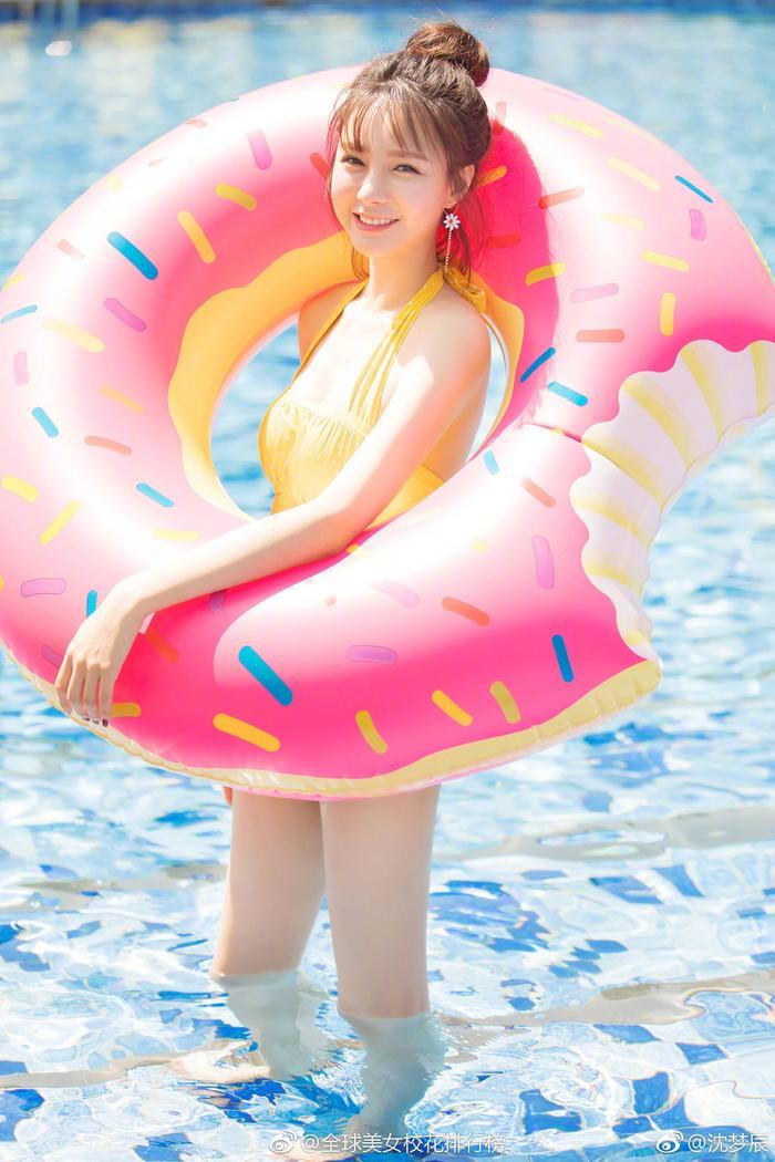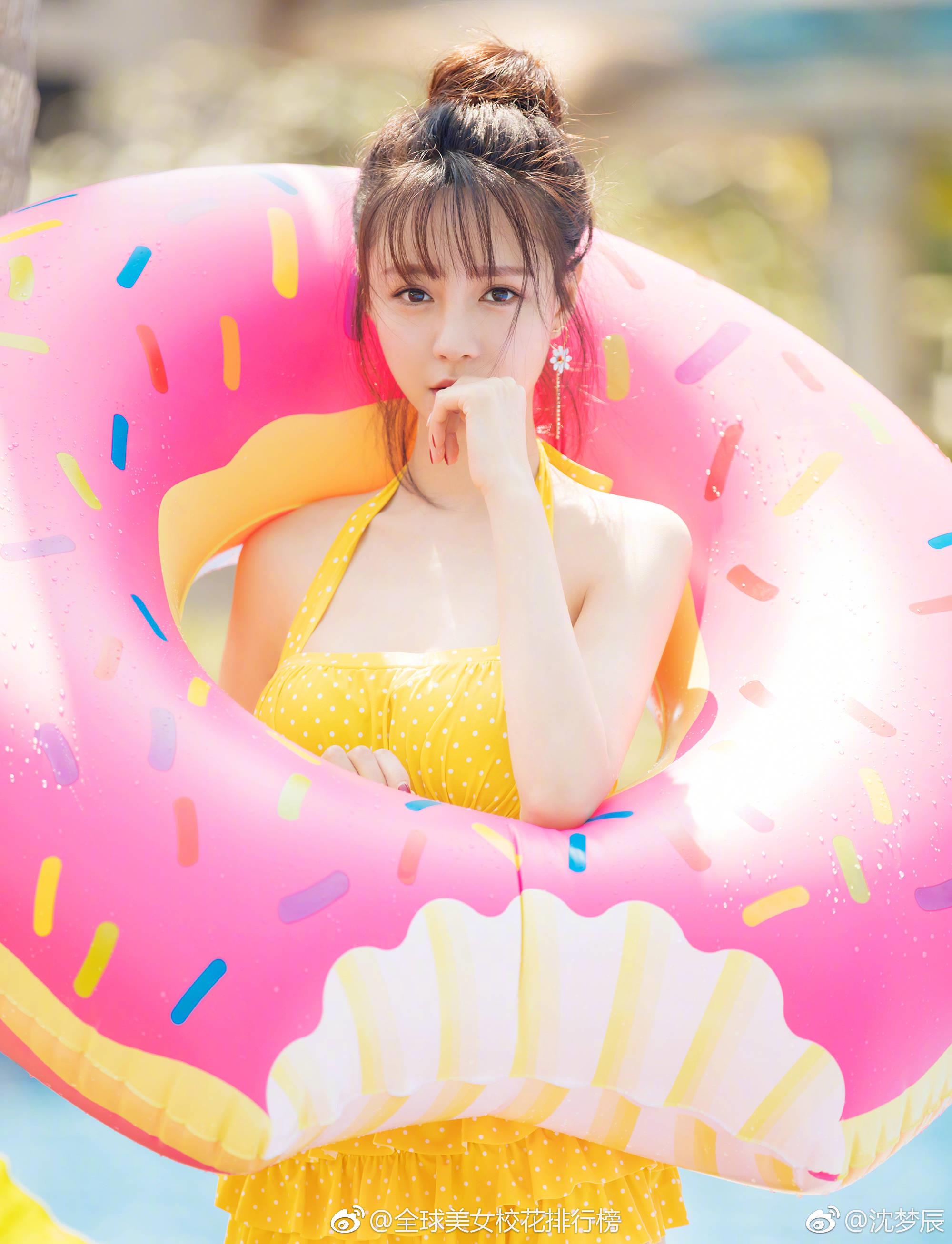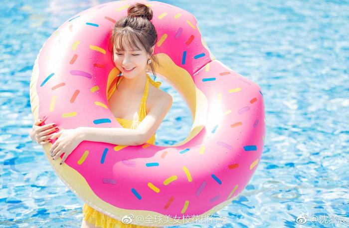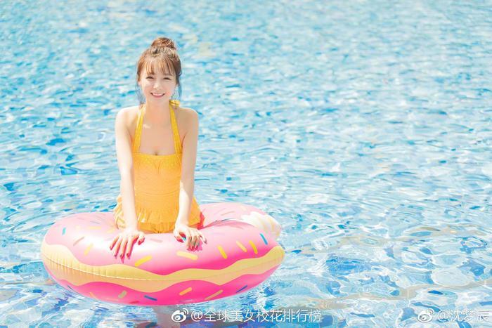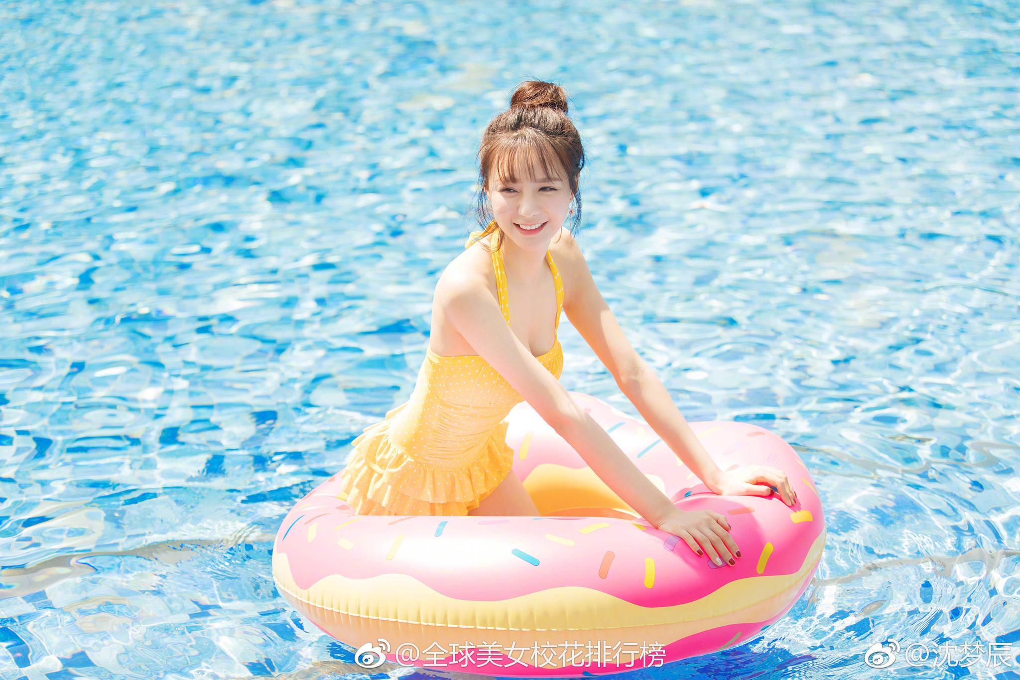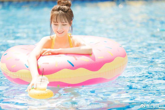 沈梦辰微博晒出一组身穿比基尼湿身戏水美照,照片中沈梦辰抱着救生圈可爱呆萌,身材火辣,美胸十分抢镜。