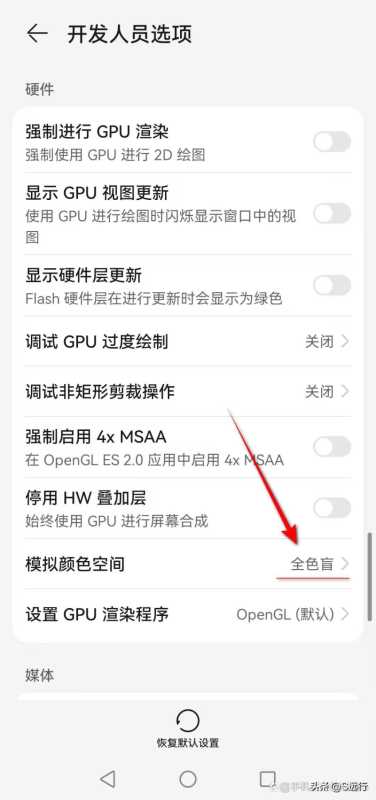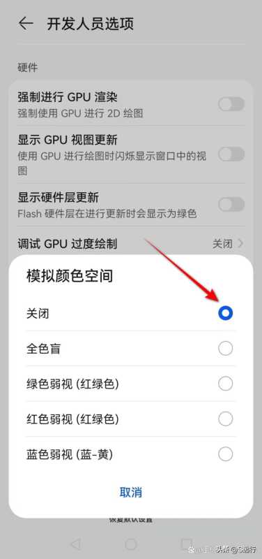 2、开发人员选项下的模拟颜色空间功能选择了“全色盲”选项,此时也会造成华为手机变为黑白屏,解决方法也很简单,只需将模拟颜色空间功能“关闭”即可恢复彩色屏了。