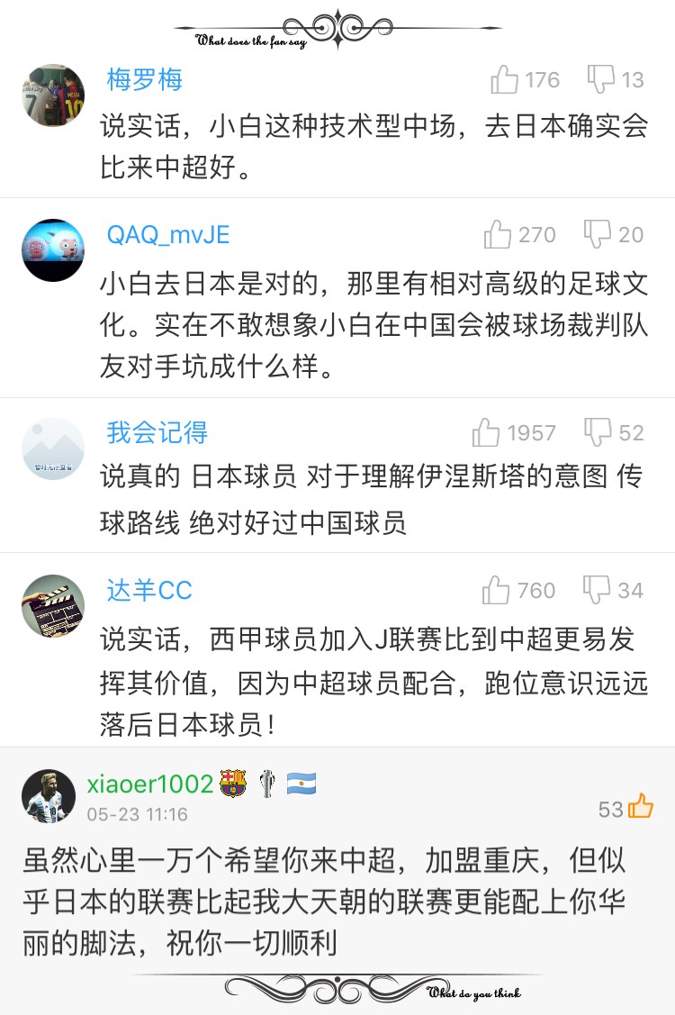 除了以上两种观点,还有的球迷则认为,相较于中超球队的水平,J联赛的球队在竞技层面上,本身就更适合伊涅斯塔的球风。