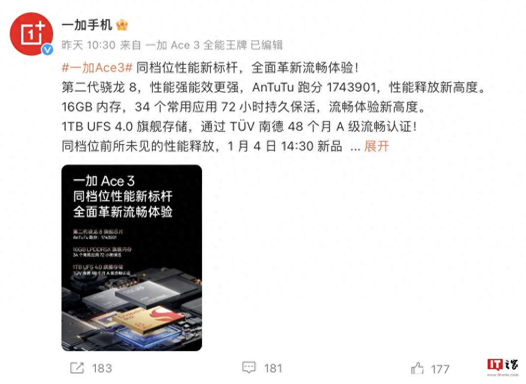 IT之家从微博中得知,一加 Ace 3 配备骁龙 8 Gen 2 芯片,AnTuTu 跑分 1743901,同时采用 1TB UFS 4.0 存储,拥有“天工散热系统 Pro”技术,并号称获得了 TÜV 南德 48 个月 A 级流畅认证。