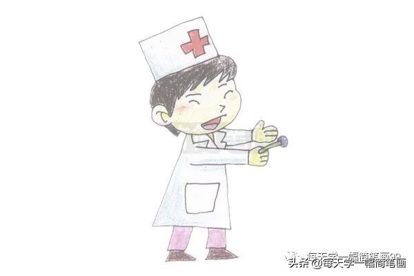 医生简笔画分步骤画法是:上戴着白帽子,穿着白褂子,手拿听诊器,帽上加上红“十”字,再画出双腿和双脚,最后给医生加上颜色。