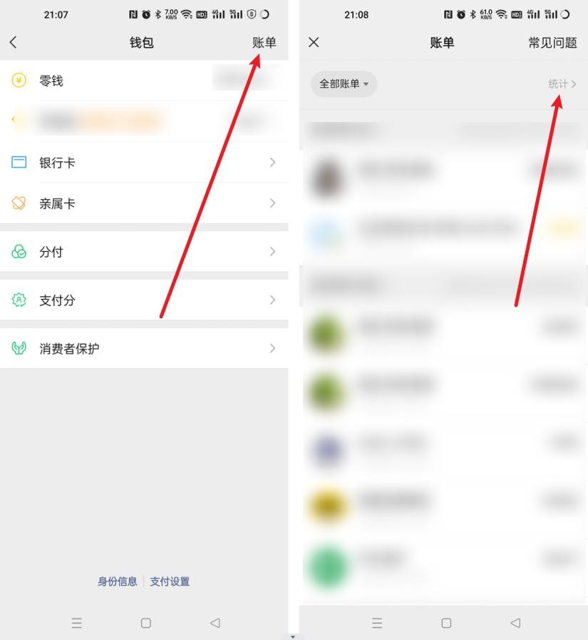 2、然后在钱包中找到并点击右上角的【账单】,再点击右侧的【统计】,如下图所示:
