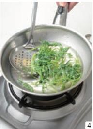 4 锅中加高汤烧开,放入菠菜焯熟,捞出装碗。