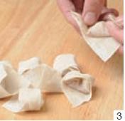 3 将馅料包入馄饨皮中,沿对角线对折成三角形,再把左右两个角向中间叠起,捏在一起成抄手生坯。