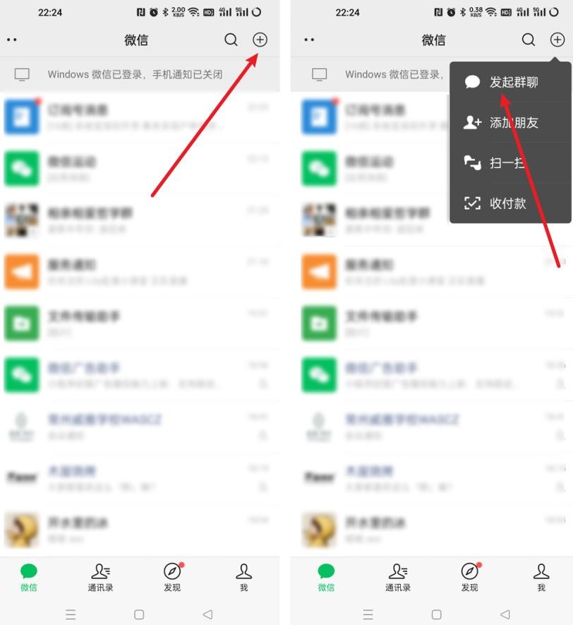 1、打开我们的微信,点击右上角的【+】号,接着找到并点击【发起群聊】,如下图所示: