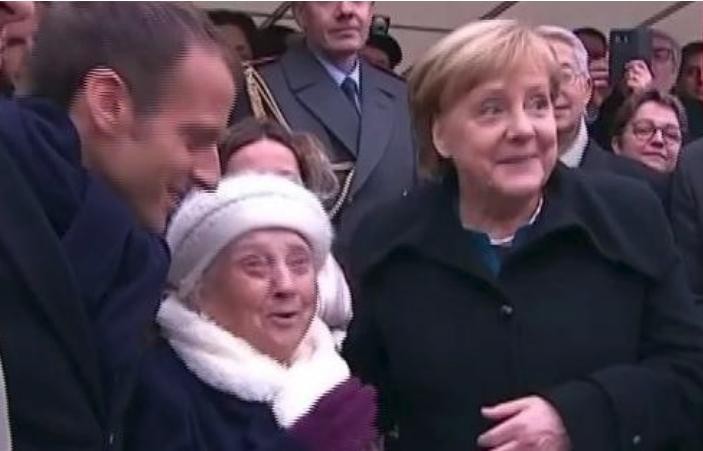 马克龙与这位老人握手时,老人特别兴奋,她说:“马克龙总统,这太不可思议了,我能和您握手,简直太棒了,”接着老人又向站在马克龙旁边的默克尔询问,“您是马克龙夫人吧”,默克尔赶紧向她解释,“我是德国总理”,老人没有听清楚,默克尔反复说了两遍,还用法语做了解释。