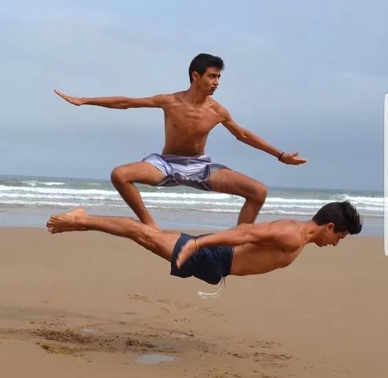 男子站在另一男子身上飞行,仿佛这男子会轻功人上飘,就问你牛不牛。