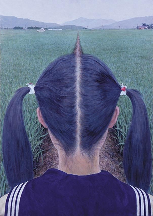 这女孩子头发中间的分割线和田埂完美的契合在一起。