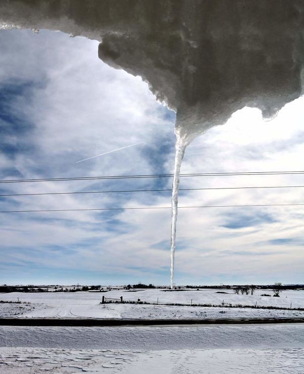 在远处,仿佛发生了龙吸水的神奇景象,但实际不是,只是屋檐下形成的冰而已。