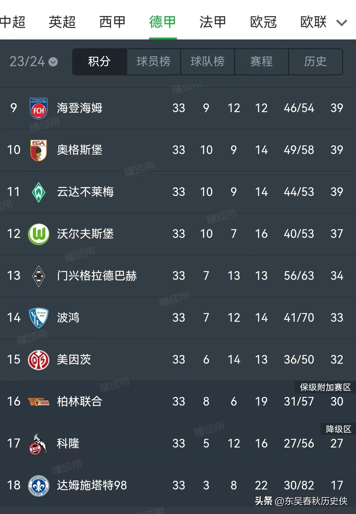 33轮德甲降级形势分析: