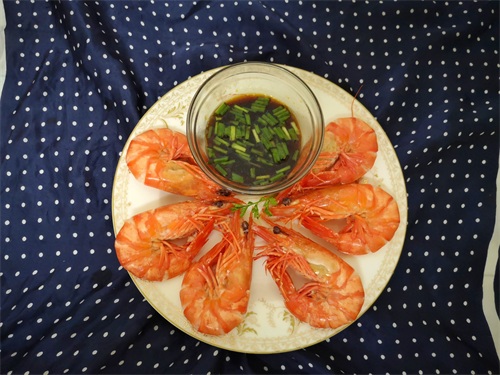 7. 把黑虎虾盛出,配上咸鲜爽口的调料汁,我们的白灼虾就上桌啦。看看很简单吧,好吃又容易做。这个虾非常筋道Q弹,蘸着调料吃,口感非常棒。