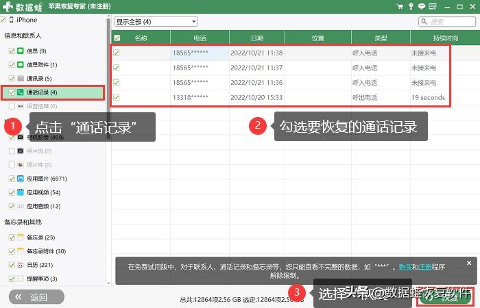 3、扫描完成后,软件将列出所有可以恢复的文件。您可以选择【通话记录】或者【语音备忘录】,再选择要恢复的文件,然后点击【恢复】按钮将它们保存到您的电脑中。