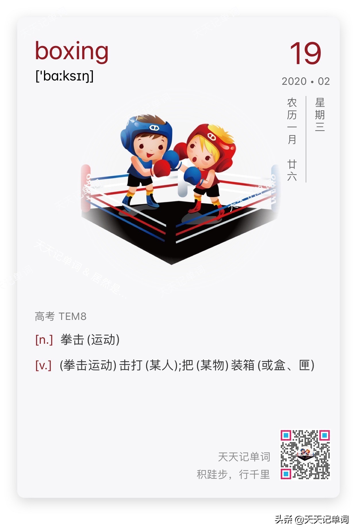 [v.] (拳击运动)击打(某人);把(某物)装箱(或盒、匣)