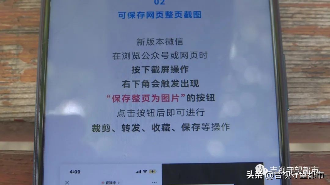 第二,可以保存网页整页截图,新版本微信在浏览公众号或者网页时,按下截屏操作,右下角会触发出现“保存整页为图片”的按钮,点击按钮后即可进行剪切、转发、收藏、保存等操作。