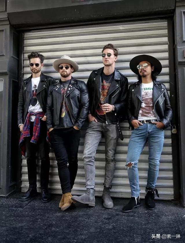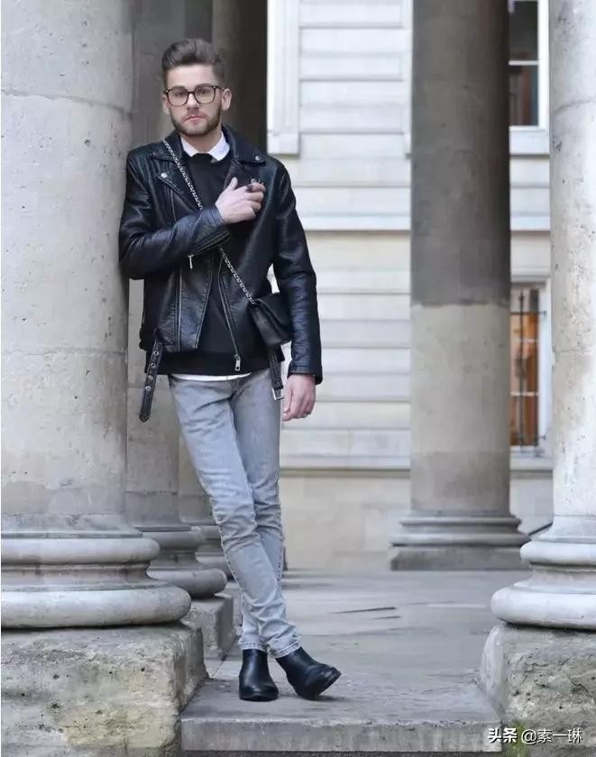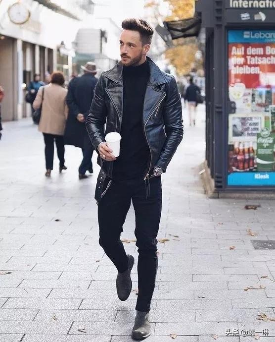 搭配一件机车夹克的时候尽显男人味,全黑的造型也显得很酷,皮靴和皮衣的质感使得整体造型也不会沉闷。