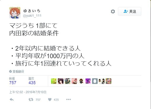 对于这个问题,就要说到近日推特不断疯传一则留言,内容是内田彩私底下与友人透漏的结婚条件,虽然还未获得本人的证实,但空穴岂能来风?一起来看一下吧: