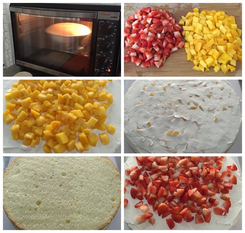 1:烤制一个十寸戚风(配方如上),烤好晾凉后脱模,平均分成三片。
